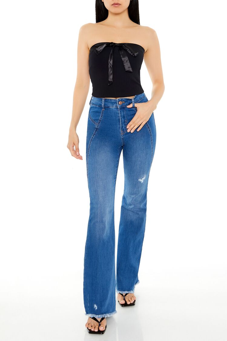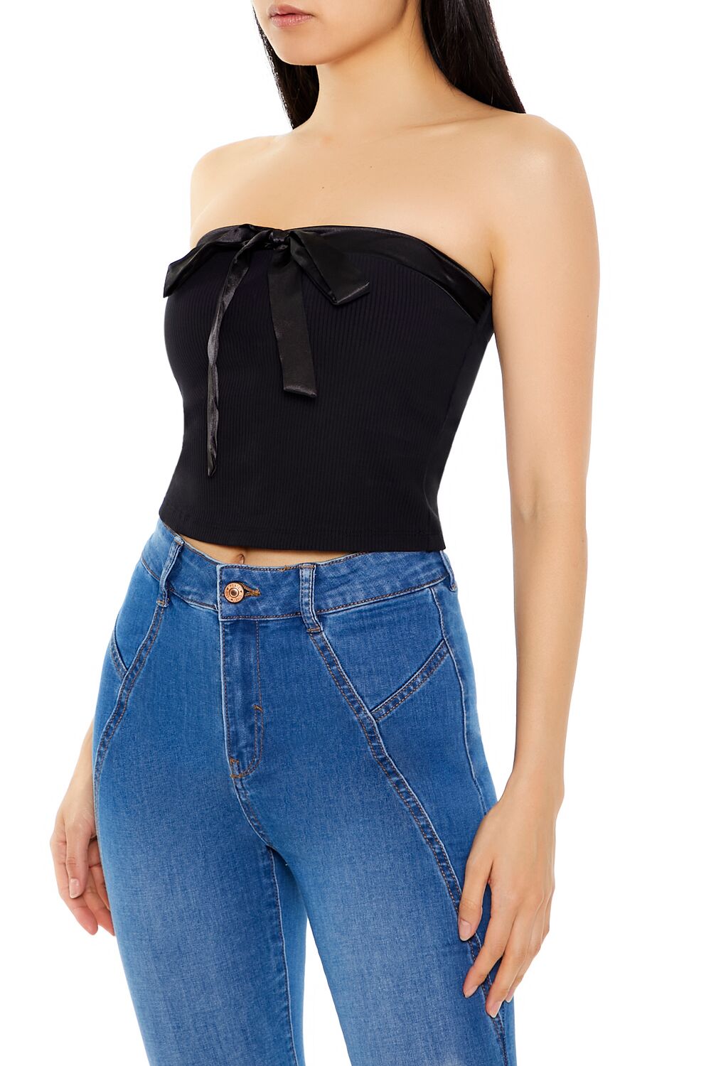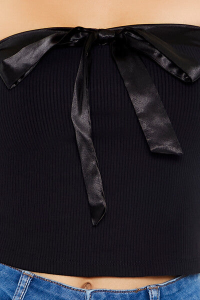 A knit tube top featuring an allover ribbed construction. straight-cut neckline and back. fitted silhouette. and a ribbon bow chest embellishment.