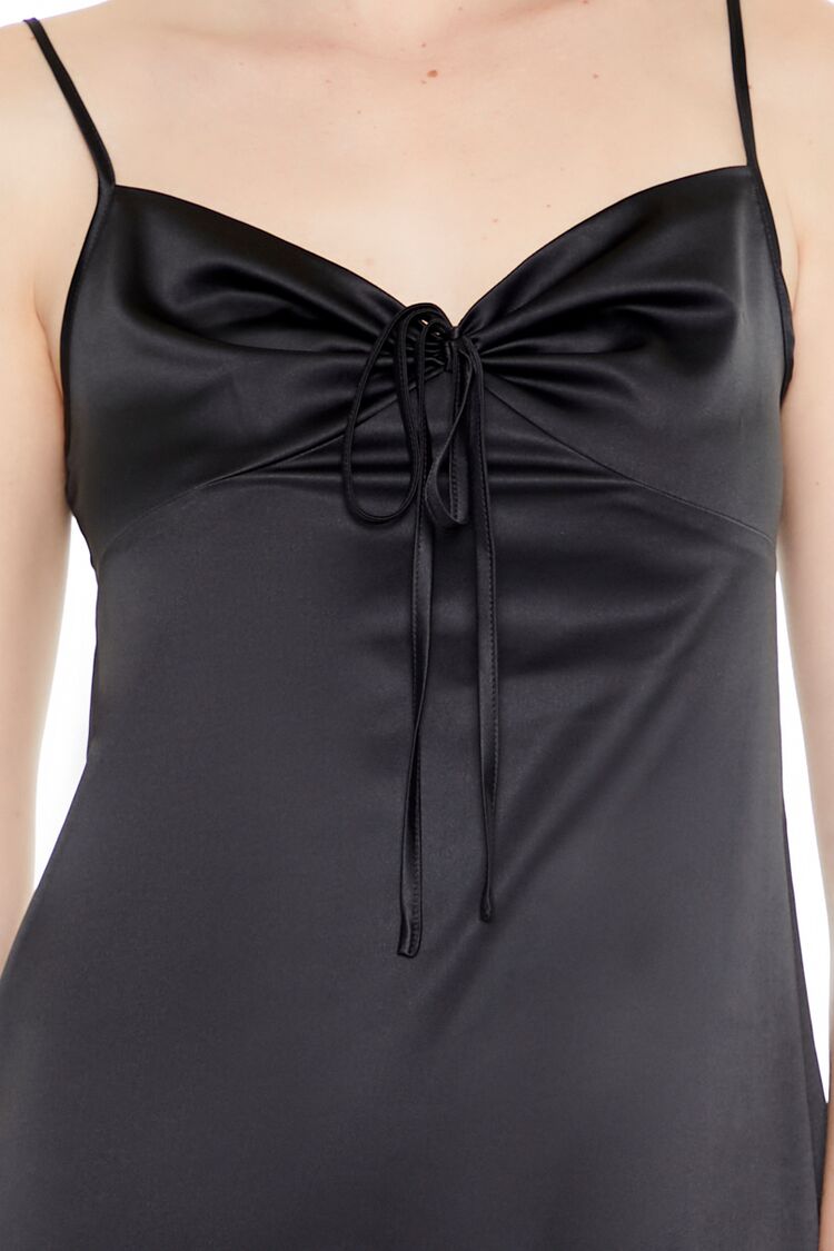 A satin mini dress featuring a sweetheart neckline. self-tie front bow embellishment. adjustable cami straps. straight-cut back with concealed zippered closure. empire waist. and fit and flare silhouette.